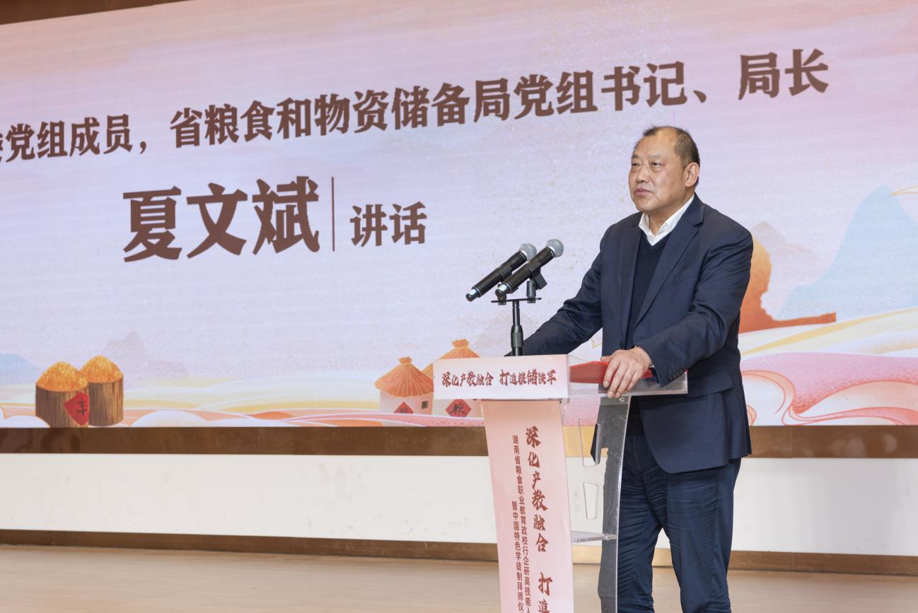 夏文斌局长代表省粮食和物资储备局党组向湖南省粮食职业教育政校行企研高技能人才培养联盟的成立表示热烈祝贺。他指出,联盟的成立,是实施人才兴粮战略,守护三湘粮食安全,建设粮食经济强省的新举措;是产学研一体化整体推进,构建粮食行业新发展格局的新探索;是破解粮食行业人才瓶颈,培养粮食技能湘军,推动省经贸技校自身高质量发展的新途径;是务实协同推动联盟的各项合作,打造湖南技工教育产教融合,科教融汇的新范式。