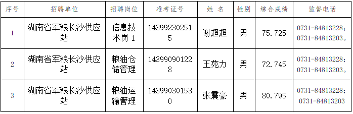 根据《湖南省省直事业单位2025年第四次集中公开招聘工作人员公告》有关要求,经报名、资格审查、笔试、面试/实操、体检、考察等程序,确定谢超超等3名同志为湖南省粮食和物资储备局所属事业单位2025年公开招聘拟聘用人员,现予以公示。